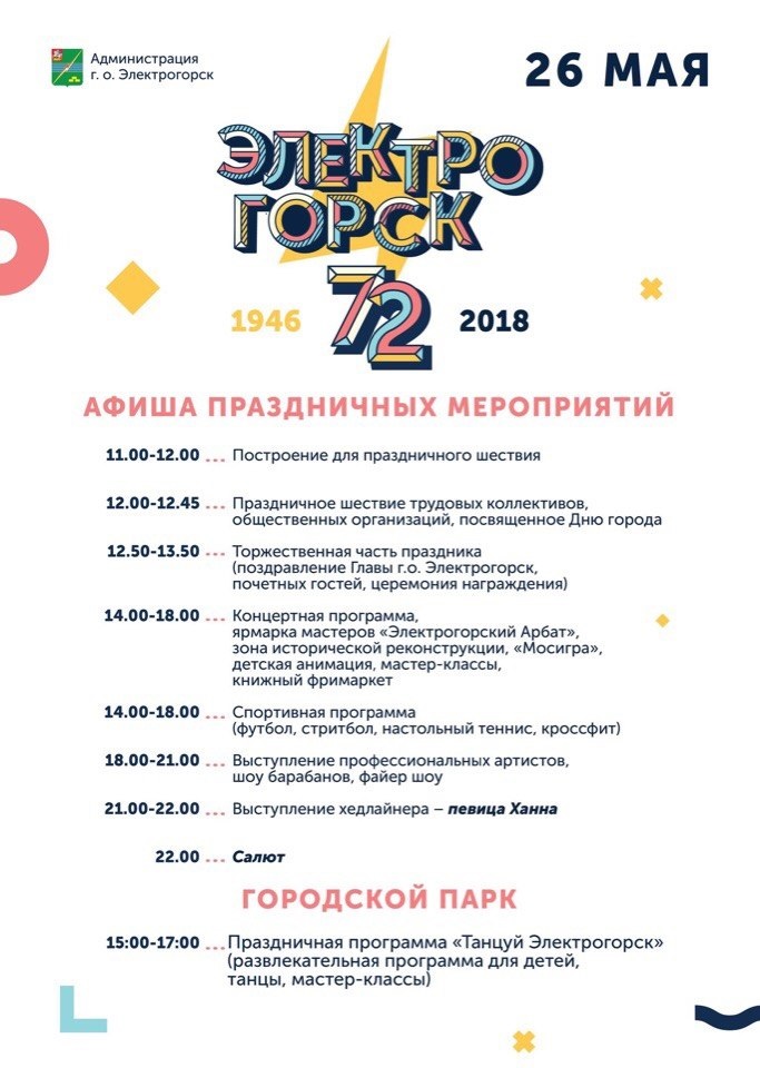 26 мая на городском бульваре состоится главное праздничное мероприятие, посвященное Дню города Электрогорск! Предлагаем вашему вниманию программу праздничных мероприятий и приглашаем каждого жителя города принять участие!